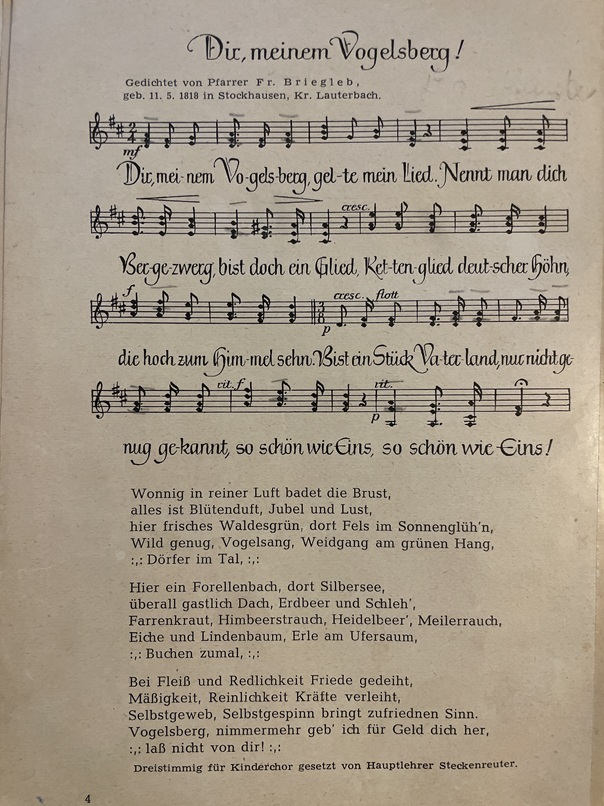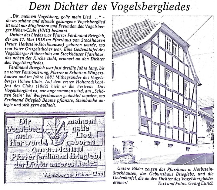 Geboren am 11. Mai 1818 in Stockhausen, gestorben 1910. Siehe gesonderte Beschreibung seiner Einträge in die Angersbacher Kirchenchronik. Ferdinand Briegleb war nach seiner Pfarrtätigkeit in Angersbach fast dreißig Jahre lang, bis zu seiner Pensionierung, Pfarrer in Schotten-Wingershausen und im Jahr 1881 Mitbegründer des Vogelsberger Höhen-Clubs (VHC). Auf dem ersten Hoherodskopf-Fest des Clubs (1882) hielt er die Festrede.34 Verfasser des Vogelsberglieds, siehe Bild.35