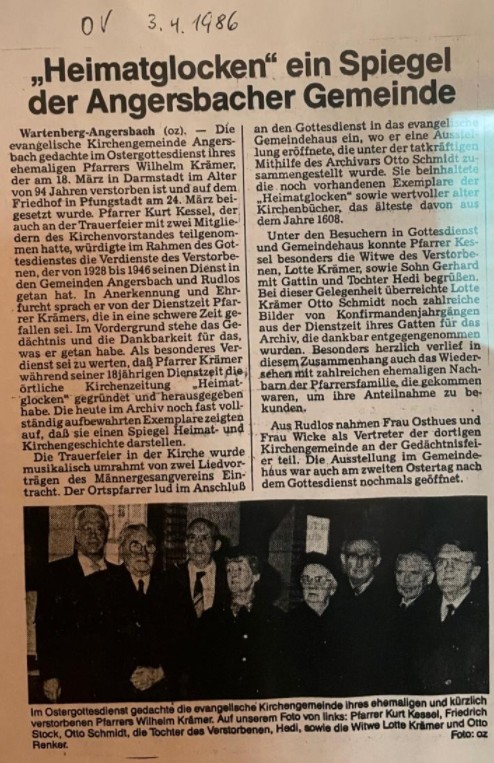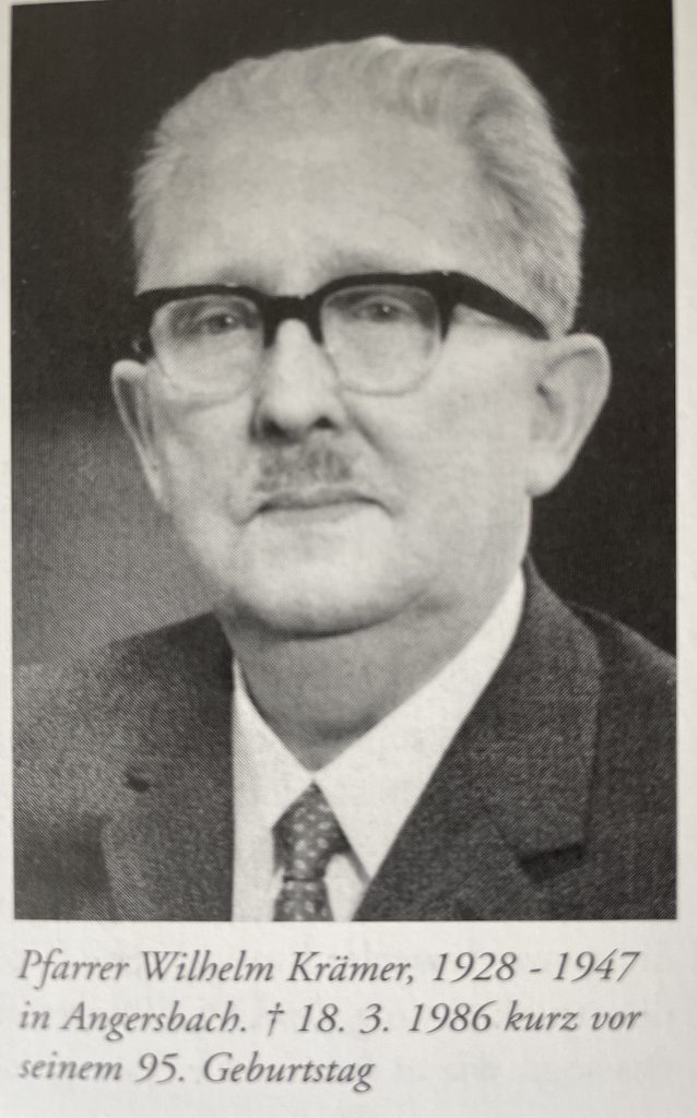 Krämer wurde am 19.5.1891 in Sandbach/Odenwald geboren. Er war von 1921 bis 1928 Pfarrer in Ober-Breidenbach und hatte vier Kinder.56 Nach seiner Zeit in Angersbach war er von 1947 bis 1957 Pfarrer in der evangelischen Kirche Kirchberg/Ruttershausen/Lollar und verbrachte dann seinen Ruhestand in Darmstadt.57 Er begründete die Angersbacher Kirchenzeitung „Heimatglocken“, die von 1928 bis 1940 erschien. Pfarrer Krämer starb am 18.3.1986.