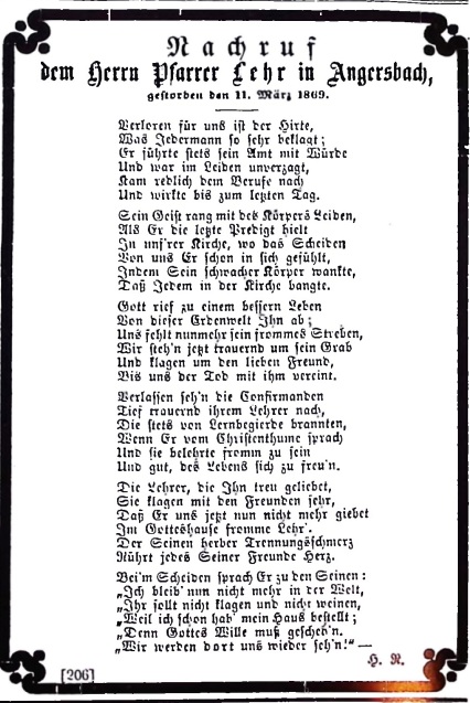 Pfarrer Friedrich Lehr, geb. 13. 3. 1814 in Gießen, gest. 11.3. 1869 in Angersbach,war nur kurze Zeit an seinem letzten Dienstort tätig, von 1867 – 1869. In dieser Zeit hat er sich, trotz schwacher Gesundheit, mit Hingabe seinen pastoralen Aufgaben gewidmet. Der Nachruf, der im Lauterbacher Anzeiger veröffentlicht wurde, legt davon Zeugnis ab.37