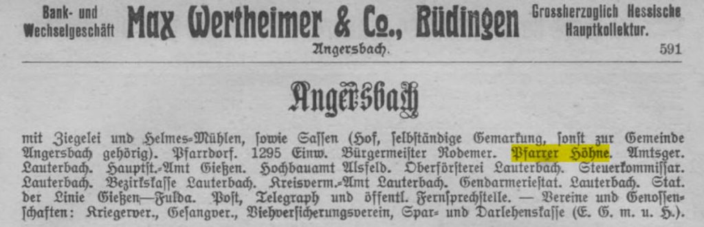 Im Landesadressbuch für das Großherzogtum Hessen von 1906 ist Johannes Höhne bereits 1906 unter „Angersbach“ aufgeführt, da er schon von 1906 bis 1908 als Pfarrverwalter in Angersbach eingesetzt war. Geboren am 24.10.1873 in Bunzlau.47