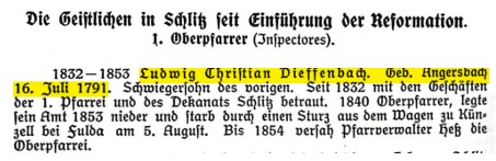 Sein Sohn Ludwig Christian wurde am 16.7.1791 in Angersbach geboren. Ludwig Christian war seit 1832 mit den Geschäften der 1. Pfarrei und des Dekanats Schlitz betraut, wo er 1840 auch Oberpfarrer wurde. Darüber hinaus war er Mitglied der Ersten Kammer des Landtags des Großherzogtums Hessen.24 Er heiratete Friederike Schlez, Tochter des bekannten Schlitzer Theologen, Pädagogen und Schriftstellers Johann Ferdinand Schlez.25