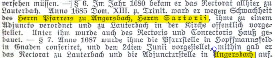 Wegen „Schwachheit“ wurde ihm als Adjunkt von 1685 bis 1687 Henricus Laurentius (Heinrich Lorenz) „verordnet“, der gleichzeitig Rektor in der Lauterbacher Lateinschule war und von 1687 bis 1703 Pfarrer in Hopfmannsfeld (*1639 +1703).16