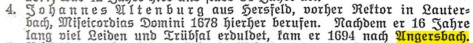 Beyenbach war Pfarrer zur Zeit der 1. Pestwelle in Angersbach (1611-1612). Er überlebte die Pest und ist erst 1621 gestorben.11