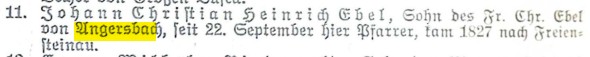 Ebel, Jahrgang 1769, war zuvor Oberpfarrer in Lauterbach und ging aus Gesundheitsgründen nach Angersbach. Er muss ein befähigter Mann gewesen sein, führte anstelle des erkrankten Inspektors Sartorius von Lauterbach einen Teil der Inspektoratsgeschäfte, in Schulvisitationen, die Pfarr- und Lehrereinführungen usw. durch. Schon 1822 wurde er 53-jährig wegen Kränklichkeit beurlaubt, aber wohl wegen seiner Verdienste nicht pensioniert. Man gab ihm Vikare als Gehilfen bei und zwar sechs an der Zahl.28 Ebel war bereits 1842 nach Lauterbach gezogen, wo er am 11. Dezember 1855 mit 86 Jahren starb.29 Der Angersbacher Christoph Möller teilt in seinem Schreibbuch im Jahr 1842 mit: „Den 5ten Juni nahm Herr Pfarrer Ebel seinen Abschied und zog nach Lauterbach, da hatte er drei Kinder. Lebt jetzt in dem Haus des Sohns, der Assessor ist.“30