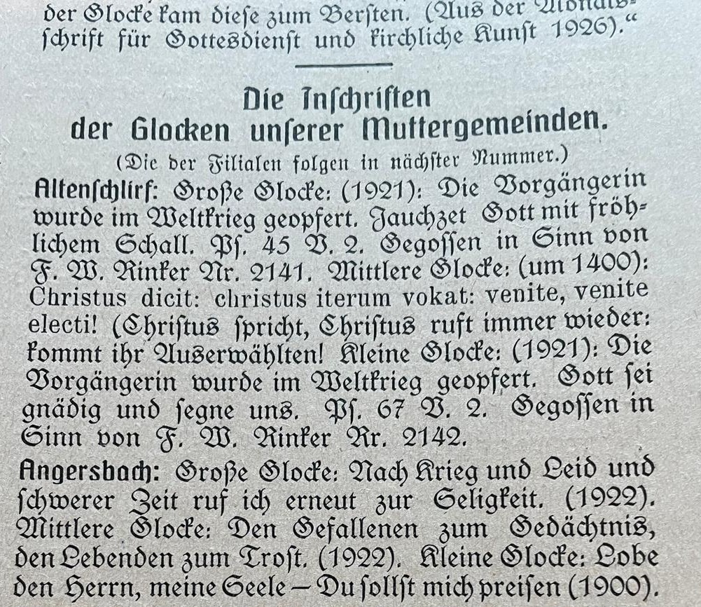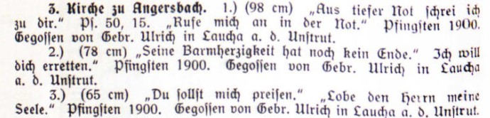 Wie gut, dass der Schlitzer Pfarrer Hermann Knodt bereits um 1917/18 die Inschriften der damaligen Kirchturm-Glocken im Vogelsberger Land und auch die der damals drei Glocken in Angersbach noch rechtzeitig aufgezeichnet hat. Darunter ist auch die kleine Glocke aus 1900 (oben Nr. 1, unten Nr. 3). Die beiden ersten, größeren, Glocken aus 1900 mussten im 1. Weltkrieg abgegeben werden (siehe oben). So kennen wir auch heute noch die Inschriften der beiden größeren Glocken, die nur ungefähr 17 Jahre in der Angersbacher Kirche ihren Dienst taten.