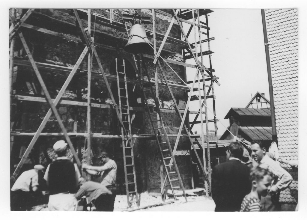 Im Jahre 1950 konnten wir zwei in der Glockengießerei Rincker, Sinn, gegossene Glocken der kleinen zugesellen, und im Jahre 1960 wurde im Zuge der großen Außenrenovierung das Geläute durch eine von der gleichen Firma gegossene vierte Glocke vervollständigt.4