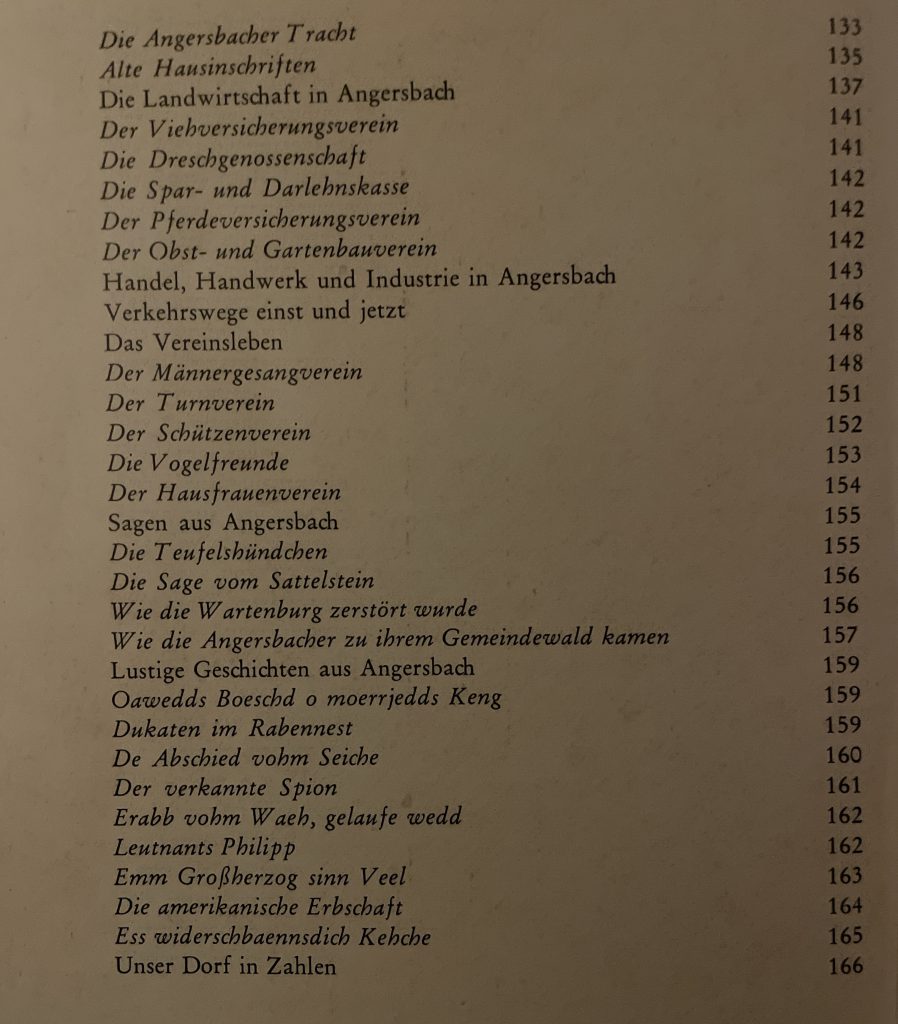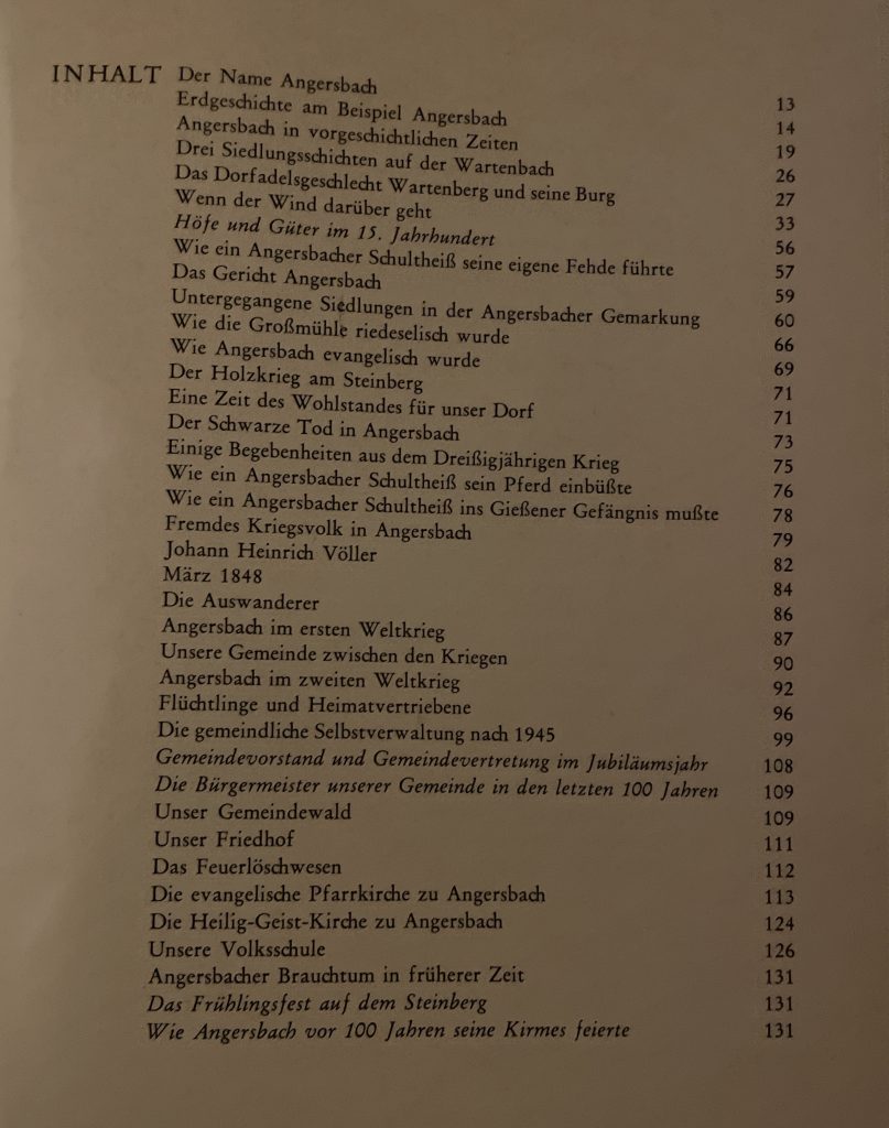 Das Inhaltsverzeichnis zeigt: Otto Schnell verschafft uns einen Überblick über alle Bereiche der Angersbacher Geschichte (und darüber hinaus). Wo nötig wird diese nicht nur beleuchtet, sondern auch tiefer eingedrungen. Die Herkunft des Namens ‚Angersbach‘, die ersten Siedler in unserer Gegend, Religion, Sagen, Vereinsgründungen, Industrialisierung. Auswanderer, 1. und 2. Weltkrieg sind Themen. Aber nie ins Allgemeine abdriftend, sondern immer mit Bezug auf unsere Heimat – Angersbach.