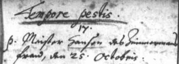 Ab Ende Oktober 1611 überschreibt Pfarrer Beyenbach die Eintragungen mit: „Tempore pestis“. Ab diesem Zeitpunkt sind 7 Seiten des Kirchenbuchs, eng beschrieben, mit Toten gefüllt. Insgesamt sind es vom 25.10.1611 bis zum 14.11.1612, also in einem Jahr: 388 Tote.