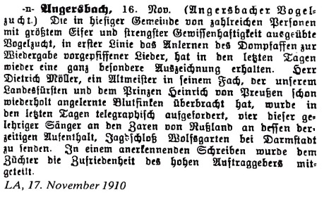 Zu den berühmtesten Käufern Angersbacher Dompfaffen gehörten die Königin von Sachsen, Prinz Heinrich von Preußen und der Großherzog von Hessen. Im Herbst 1910 traf bei dem Vogelhändler und Züchter Dietrich Möller ein Telegramm aus dem Jagdschloß Wolfsgarten bei Darmstadt ein, in dem der Zar von Rußland, der sich zu dieser Zeit dort aufhielt, vier gelehrige Sänger bestellte. Das Dankesschreiben, das dieser nach erfolgter Lieferung übersandte, ist noch vorhanden und wird von der Familie als Erinnerung an die Glanzzeit der Angersbacher Blutfinkenzucht aufbewahrt.“2