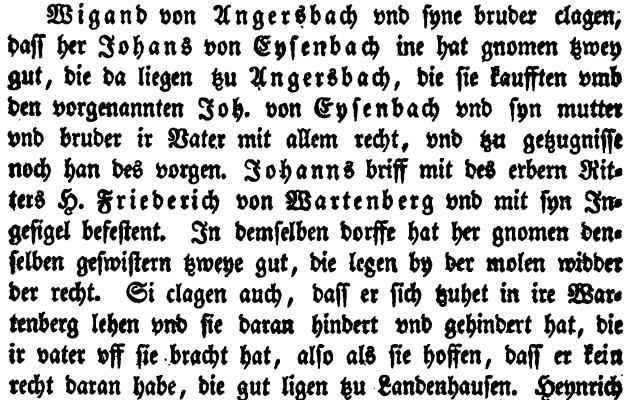 Das Geschlecht derer „von Angersbach“ ist somit tatsächlich in dem „von Wartenberg“ aufgegangen, wobei beide Namen (von Wartenberg und von Angersbach) in unserer Gegend noch nebeneinander bis mindestens 1336 auftauchen: