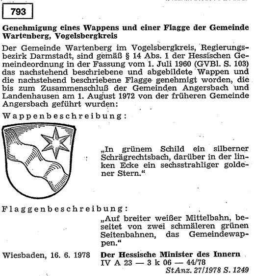 Nach dem Zusammenschluss Angersbachs und Landenhausen zur Großgemeinde Wartenberg im Jahr 1972 wurde das Angersbacher Wappen als Wappen der Gemeinde Wartenberg im Jahr 1978 übernommen.14