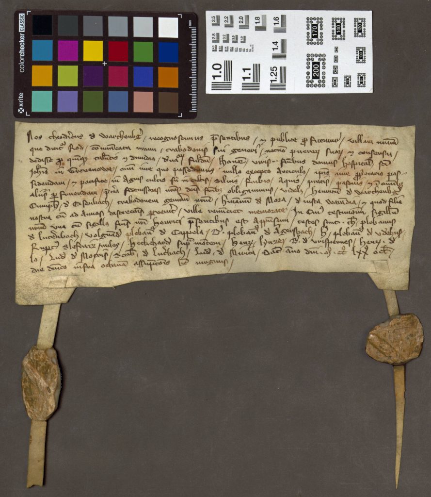 9. Baur, Hessische Urkunden, schreibt auf S. 168: „Gesiegelt hat der Aussteller (also Theoderich) und sein Sohn Heinrich. Die Siegel hängen nur in kleinen Stückchen noch an.“ ↩︎