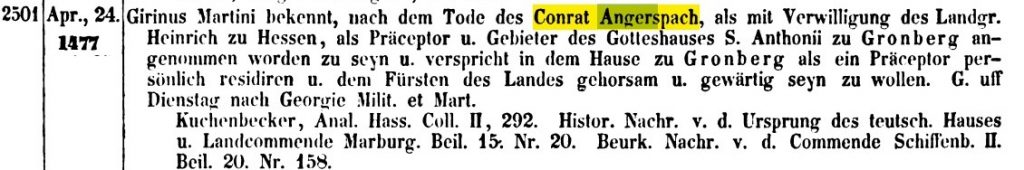Das Wappen der „von Angersbach“ ist (mittlerweile) bekannt. Und zwar war ein Conrad von Angersbach Präzeptor11 des ehemaligen Antoniterklosters in Grünberg.